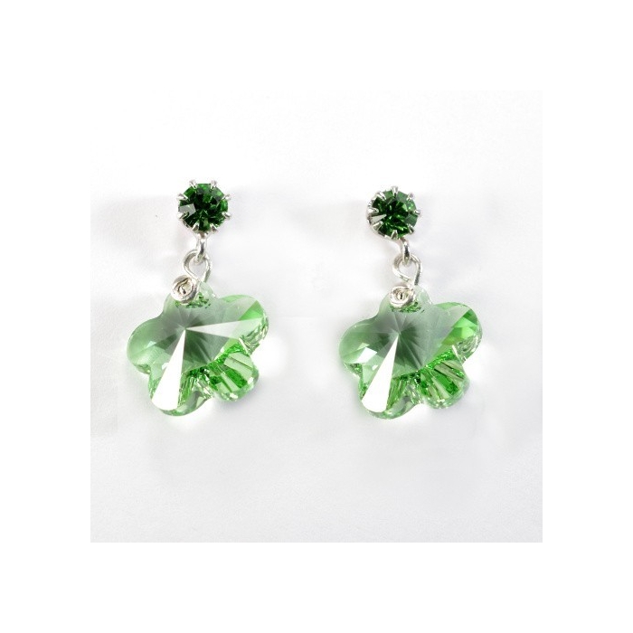 Dámské náušnice s dvěmi křišťály Swarovski. Jeden menší křišťál Swarovski je zafasovaný v horní části náušnice. Druhý větší křišťál Swarovski broušený do tvaru květu je zavěšený na náušnici. Velmi hezké provedení náušniček s křišťály Swarovski.