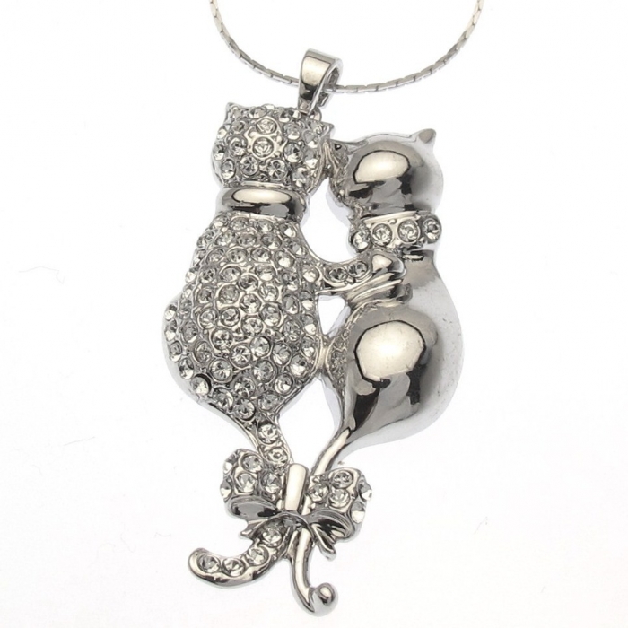 Náhrdelník se dvěmi kočičkami vedle sebe sedící. Jedna kočička je celá vykládaná malými čirými křišťálky Swarovski a druhá kočička má vykládaný obojek a mašličku. Celý šperk včetně řetízku je pokovem tenkou vrstvou velmi drahého kovu Rhodia, který dodává šperku krásnou barvu a je antialergický. Náhrdelník je dodáván v dárkové krabičce Swarovski Elements.