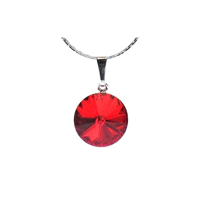 Dámský náhrdelník s křišťálem Swarovski v červené barvě. Průměr křišťálu Swarovski je 14mm a celková výška přívěsku je 24mm. Přívěsek je zavěšen na řetízku délky 44cm. Náhrdelník lze doplnit o náušnice, prsten a náramek se stejnou barvou křišťálu Swarovski. Náhrdelník je vyroben z obecného šperkařské kovu a je pokoven tenkou vrstvou velmi drahého kovu Rhodia. Náhrdelník je dodáván v dárkové krabičce Swarovski Elements.