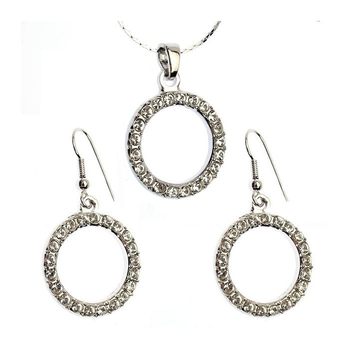 Souprava kruhy vyrobená se Swarovski křišťály v barvě Crystal. Souprava je tvořena náušnicemi a přívěskem zavěšným na řetízku délky 45cm. Souprava je vyrobená z obecného šperkařského kovu a je potažena velmi drahým kovem Rhodiem, které dává šperku antialergické vlastnosti a barvu bílého zlata, které se také tímto kovem pokovuje. Souprava je dodávána v dárkové krabičce Swarovski Elements.