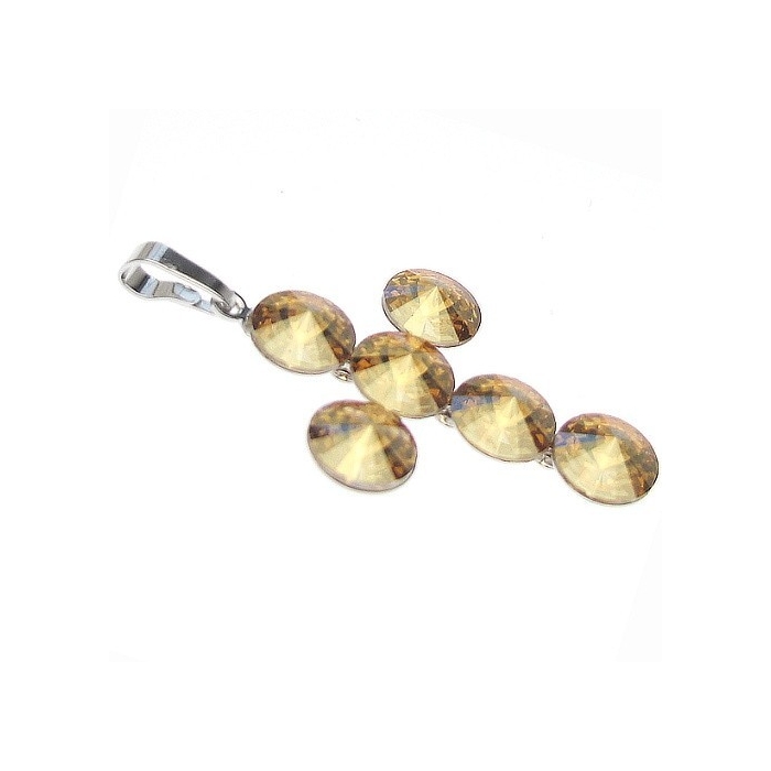 Přívěsek křížek je vyroben ze šperkařského kovu, který je pokoven tenkou vrstvou velmi drahého kovu Rhodia, který dodává šperku antialergické vlastnosti, krásnou barvu, lesk a vzhed bílého zlata, které se tímto kovem také upravuje. Křížek je osazen 6-ti pravými křišťály Swarovski o průměru 8mm ve zlatavé barvě. Šperk je dodáván v dárkové krabičce Swarovski Elements.