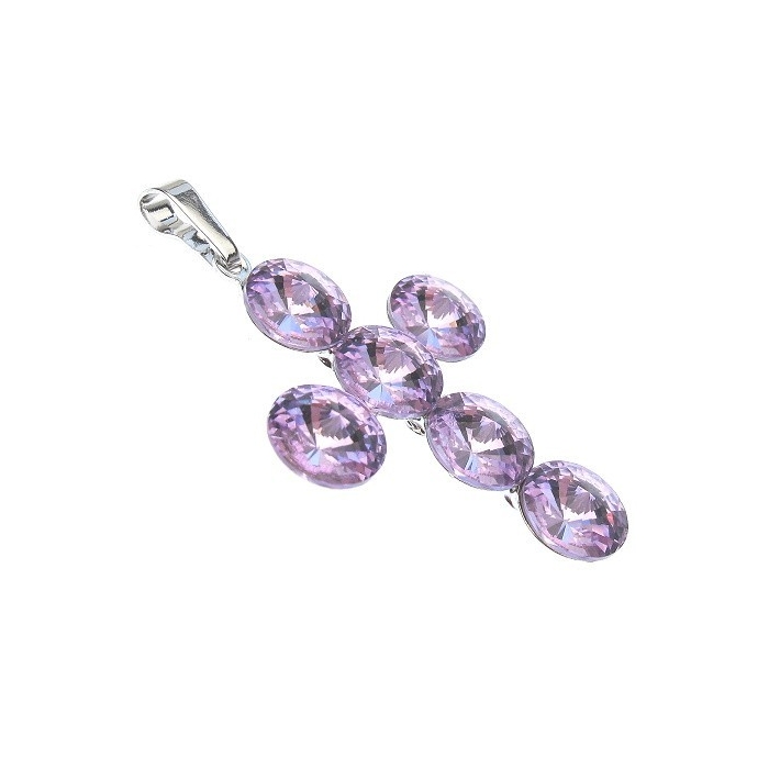 Přívěsek křížek je vyroben ze šperkařského kovu, který je pokoven tenkou vrstvou velmi drahého kovu Rhodia, který dodává šperku antialergické vlastnosti, krásnou barvu, lesk a vzhed bílého zlata, které se tímto kovem také upravuje. Křížek je osazen 6-ti pravými křišťály Swarovski o průměru 8mm ve fialkové barvě. Šperk je dodáván v dárkové krabičce Swarovski Elements.