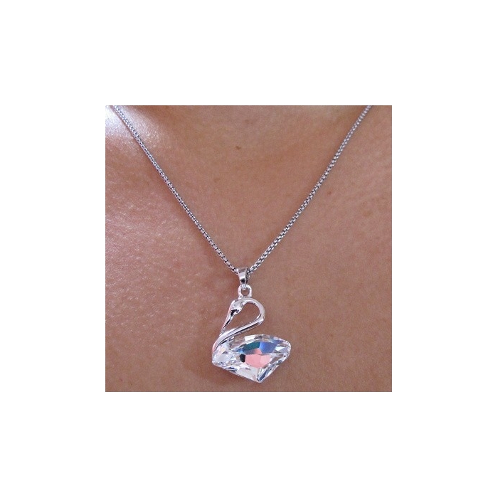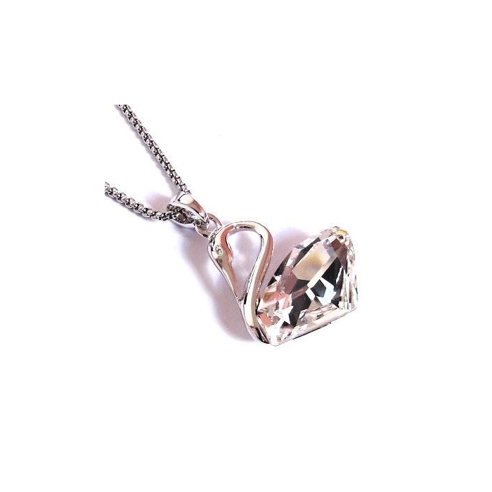 Náhrdelník LABUŤ s čirým Swarovski křišťálem. Náhrdelník je vyroben ze šperkařského obecného kovu (100% bez niklu) a je potažen velmi drahým kovem Rhodiem. Řetízek délky 45cm je taktéž upraven rhodiováním. Náhrdelník je dodáván v dárkové krabičce Swarovski Elements.