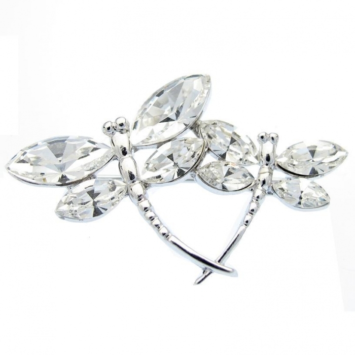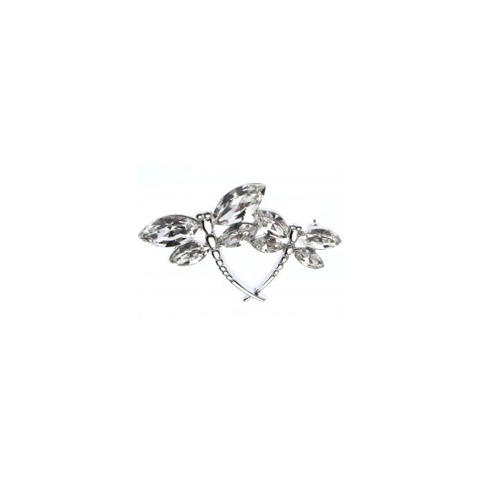Dámská brož ve tvaru dvou vážek. Brož je dekórována čirými krystaly Swarovski a je potažena tenkou vrstvou velmi drahého kovu Rhodia, které dodává šperku krásnou barvu, zabraňuje černání šperku a je antialergenní. Brož je dodáváná v dárkové krabičce Swarovski Elements.