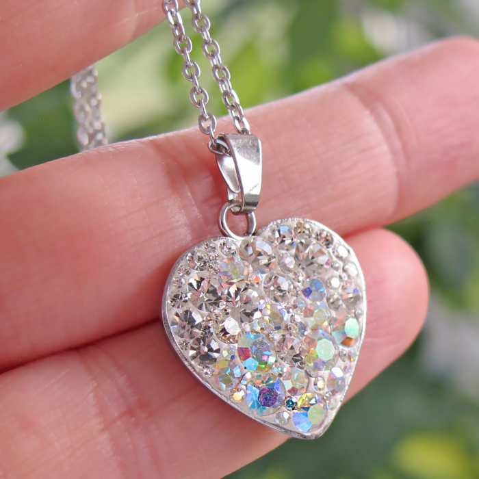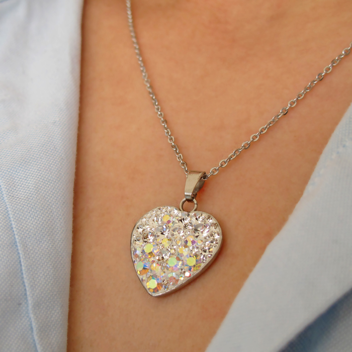 Náhrdelník se srdcem vykládáným Swarovski křišťály v barvě Crystal AB. Křišťály Swarovski jsou vsazeny do speciální šperkařské hmoty ve světle šedé barvě, ve které krásně vynikne právě tato barva křišťálů. Rozměry srdíčka jsou 29x16mm a délka řetízku je 44cm + prodloužení 7cm. Celý šperk je pokoven velmi drahým kovem Rhodiem. Náhrdelník je dodáván v dárkové krabičce Swarovski Elements.