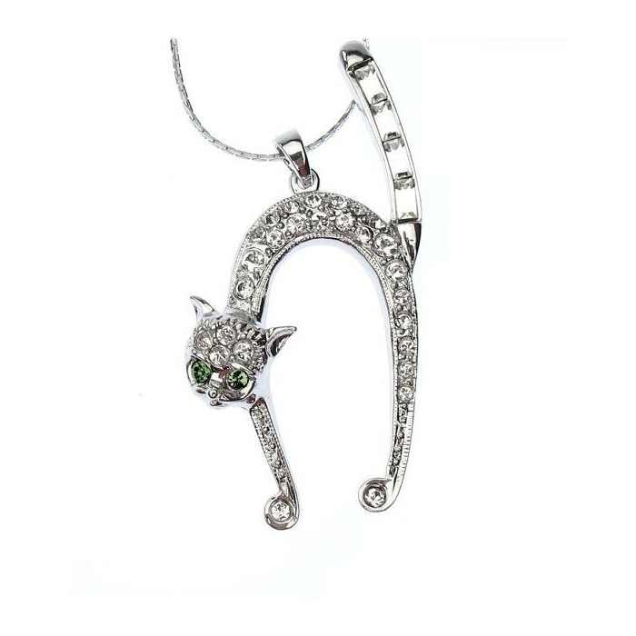 Dámský moderní náhrdelník s křišťály Swarovski. Krásný masivní přívěsek ve tvaru KOČKY je osázen malými čirými křišťály Swarovski. Oči jsou osazeny tmavě zelenými křišťály Swarovski. Přívěsek je zavěšen na řetízku z rhodiovaného šperkařského obecného kovu. Náhrdelník je dodáván v dárkové krabičce Swarovski Elements.