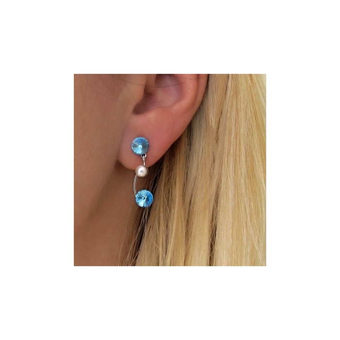 Dámské náušnice vyrobené z obecného šperkařského kovu, které jsou pokoveny velmi drahým antialergickým kovem Rhodiem, které dodává těmto náušnicím krásnou barvu bílého zlata, které se Rhodiem také pokovuje. Káždá náušnice je osazena dvěmi Swarovski křišťálky v barvě Aquamarine a jednou perlou Swarovski v barvě White Pearl.