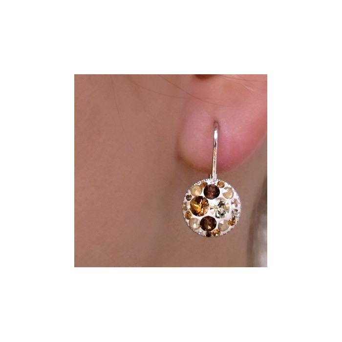 Náušnice jsou vyrobeny ručním vkládáním křišťálů Swarovski® do speciálního gelu od firmy Swarovski®, proto se usazení křišťálků může lišit jak ve velikosti křištálů, tak v kombinaci, oproti fotografii. V těchto náušnicích jsou kombinované různé barvy křišťálů, ale celkový efekt je tvořen do hnědooranžova.