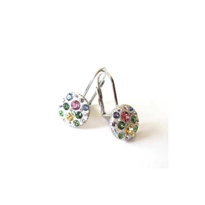 Náušnice jsou vyrobeny ručním vkládáním křišťálů Swarovski® do speciálního gelu od firmy Swarovski®, proto se usazení křišťálů může lišit jak ve velikosti křišťálů, tak v kombinaci, oproti fotografii. V těchto náušnicích jsou kombinované různé barvy křišťálů.