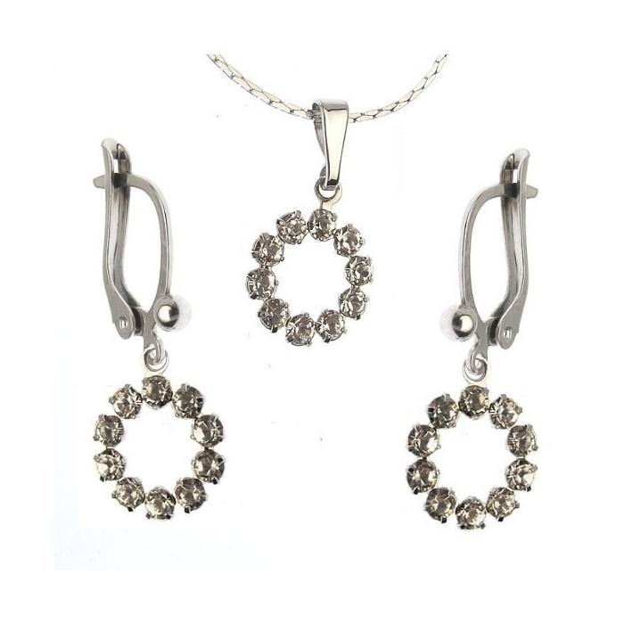 Souprava s malými Swarovski křišťálky v barvě Crystal. Náušnice délky 28mm jsou ozdobené Swarovski křišťály, které jsou vsazeny do kruhu o průměru 12mm. Přívěsek délky 21mm je zavěšen na řetízku dlouhém 44cm. Celá souprava je pro lepší vzhled a antialergické vlastnosti pokovena velmi drahým kovem Rhodiem. Souprava je dodávána v dárkové krabičce Swarovski Elements.