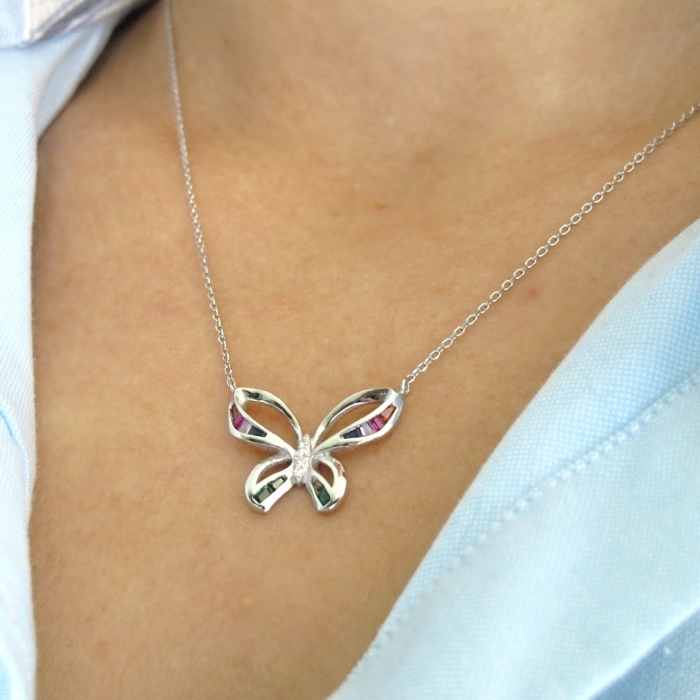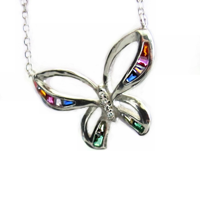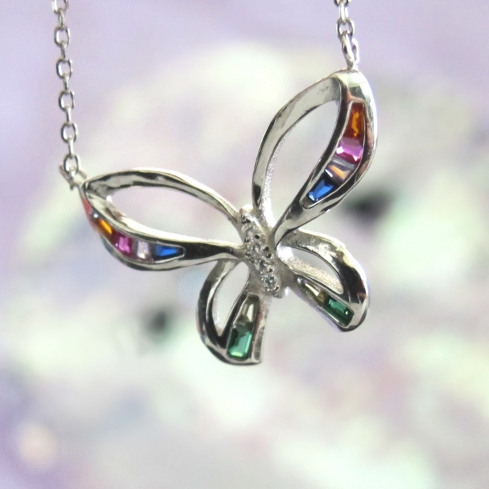 Stříbrný náhrdelník motýlek s barevnými zirkony je vyroben z kvalitního stříbra ryzosti 925/1000 a navíc je pokoven velmi drahým kovem Rhodiem. Náhrdelník má délku 39cm + 5cm prodlužovací řetízek, kterým si můžete nastavit délku až na 44cm. Náhrdelník má zapínání na pérový kroužek a je dodáván v dárkové krabičce na šperky.