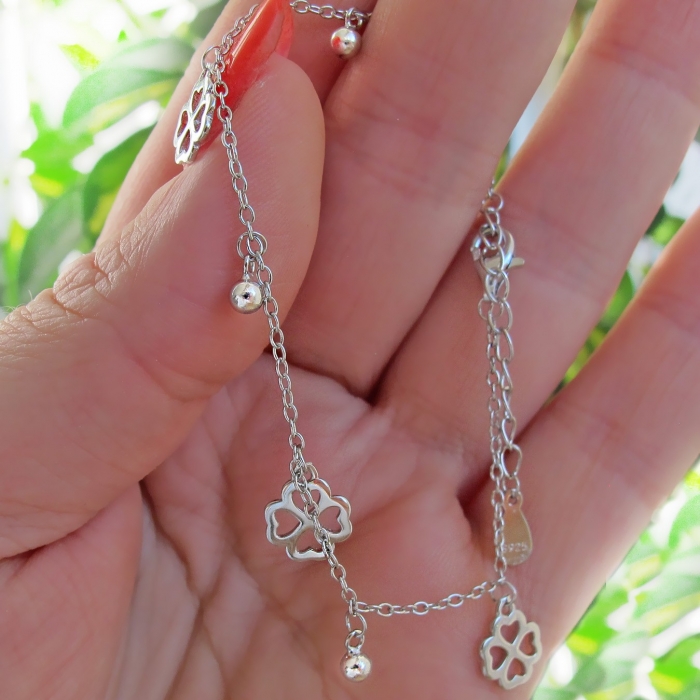 Stříbrný náramek se zavěšenými kuličkami a čtyřlístky Rhodium 16+3cm