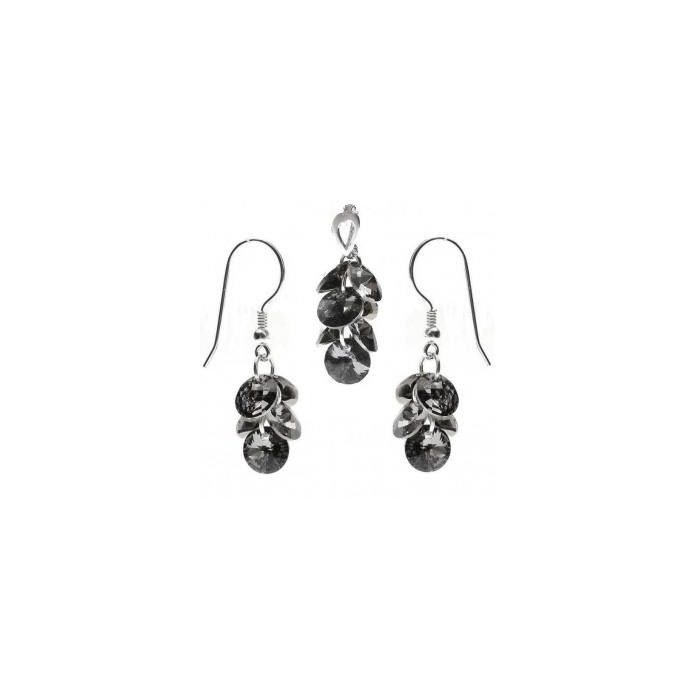 Luxusní dámská stříbrná souprava vyrobena s krásným Swarovski křišťály. Náušnice jsou dlouhé cca 40mm a jsou tvořeny 5-ti tmavými křišťály. Při pohybu se křišťály volně pohybují a odrážejí krásné odlesky. Přívěsek je tvořen 7-mi křišťálky Swarovski a jeho délka je 33mm. Souprava je dodávána v dárkové krabičce Swarovski Elements. Soupravu můžete doplnit o stříbrný šperkový řetízek z naší nabídky.