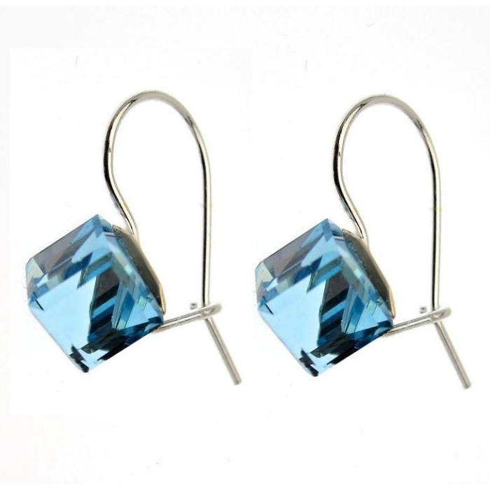 Dámské stříbrné náušnice zdobené křišťály Swarovski ve tvaru kostiček. Barva křišťálů Swarovski je světle modrá. Náušnice mají zapínání s háčkem, které brání vypadnutí náušnice z ucha. Velmi jemné decentní provedení náušnic můžete také doplnit o stříbrný přívěsek kostička, ve stejné barvě křišťálu.
